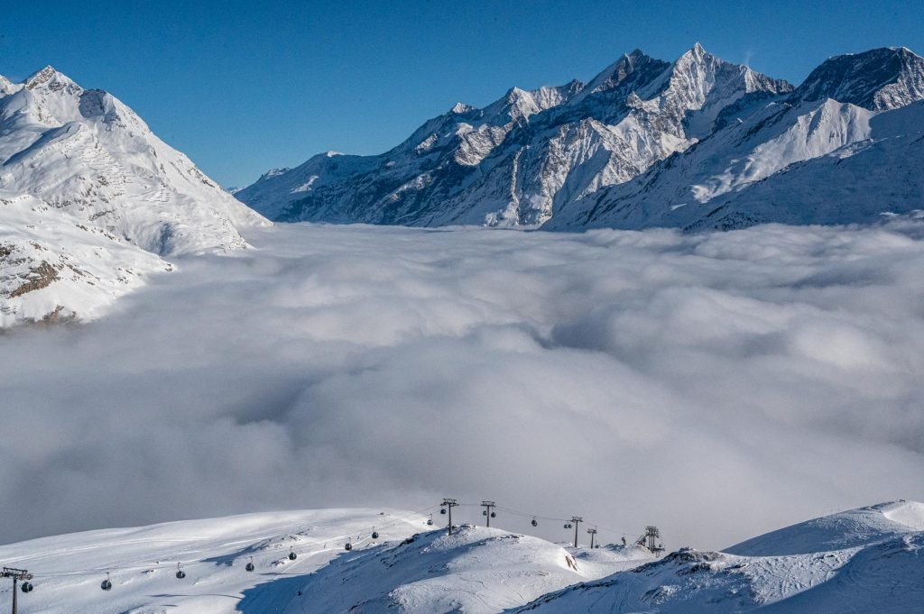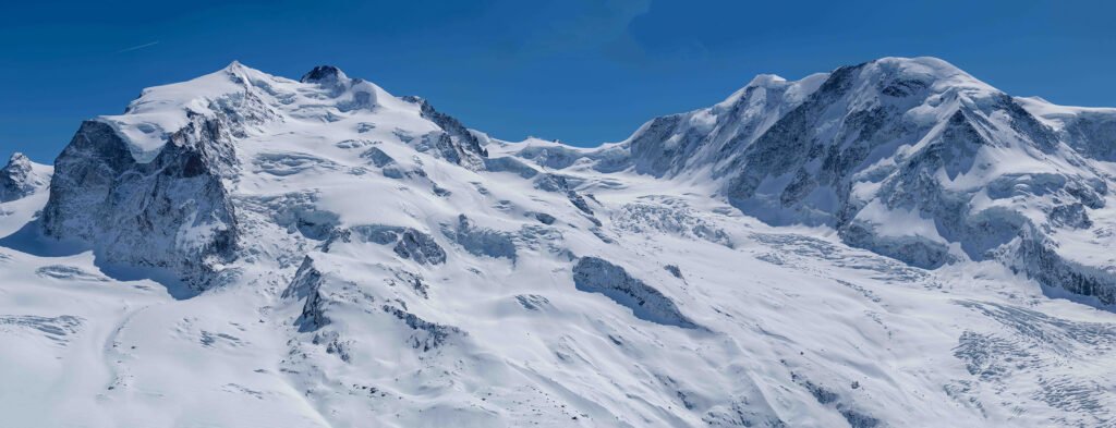 A jaw dropping view over the Gorner glacier and the north face of the main alpine ridge from Lyskamm to Breithorn