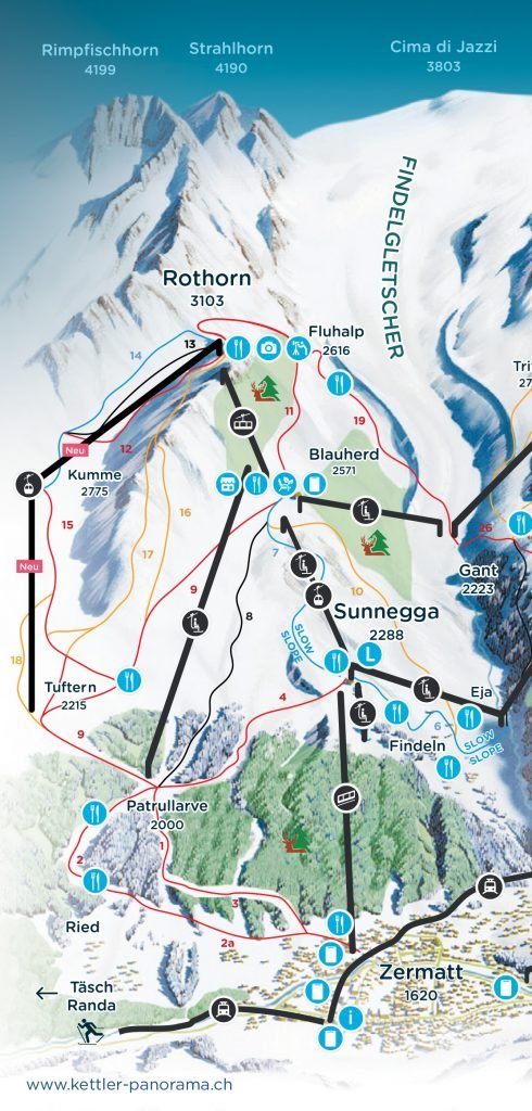 - Take the red (19) from Rothorn to Gant. Here the Hohtalli cable car will access the long red (44) with a challenging first few turns and then the long traverse across to Riffelberg.