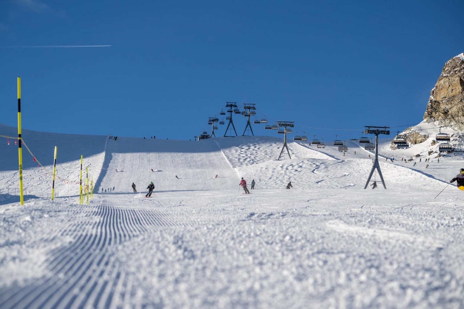 Trockener Steg or the Glacier as it is often called is an impressive area with incredibly wide runs and views of the Matterhorn (of course), Italy and on a clear day Mont Blanc. The snow is usually very good due to the altitude, but this also can bring wind and low temperatures.